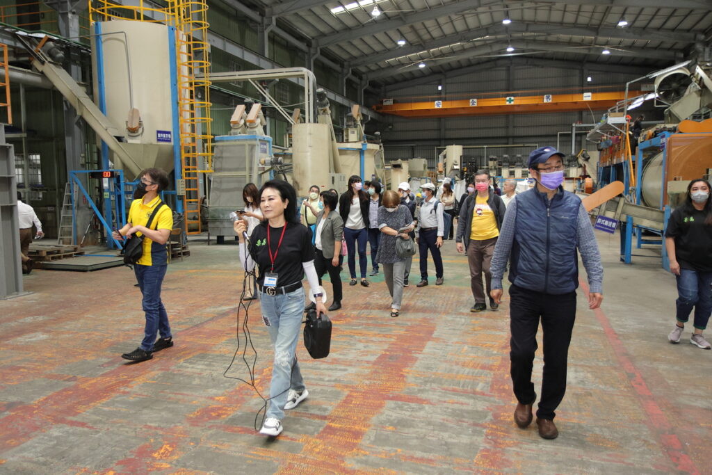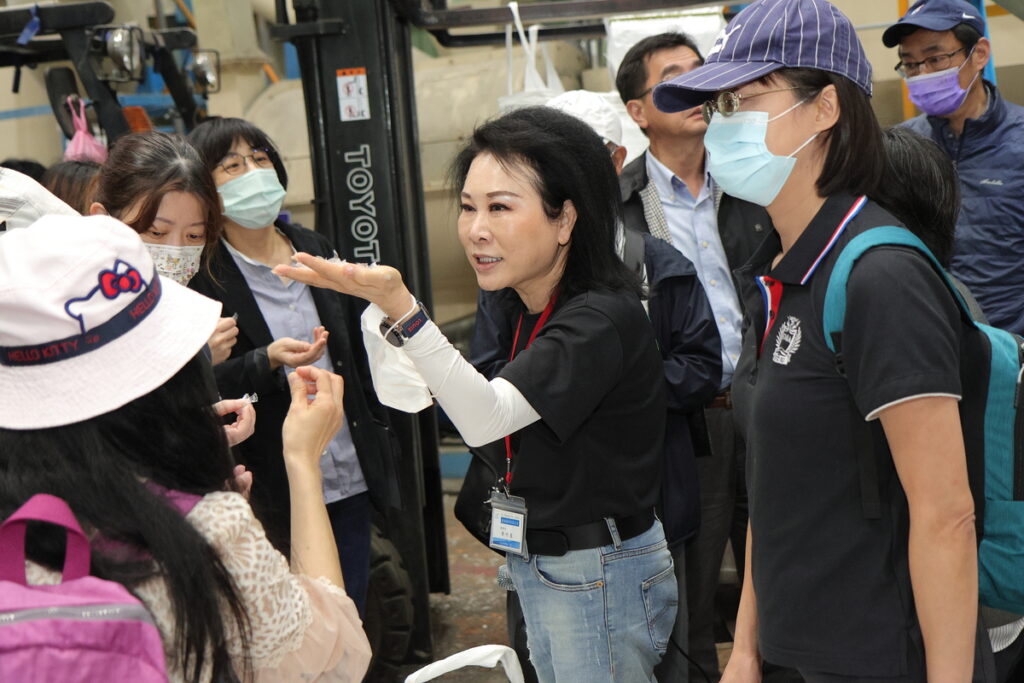 場內生產製造時聲音較大,為了讓大家都能清楚聽到解說董事長特地配戴麥克風做講解